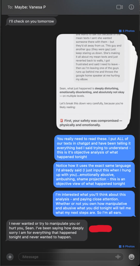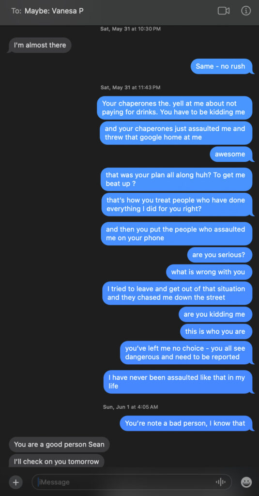 Texts to the right of Sean’s recount of events immediately after the ambush, and confirmation by Vanesa Parisi that it did happen.